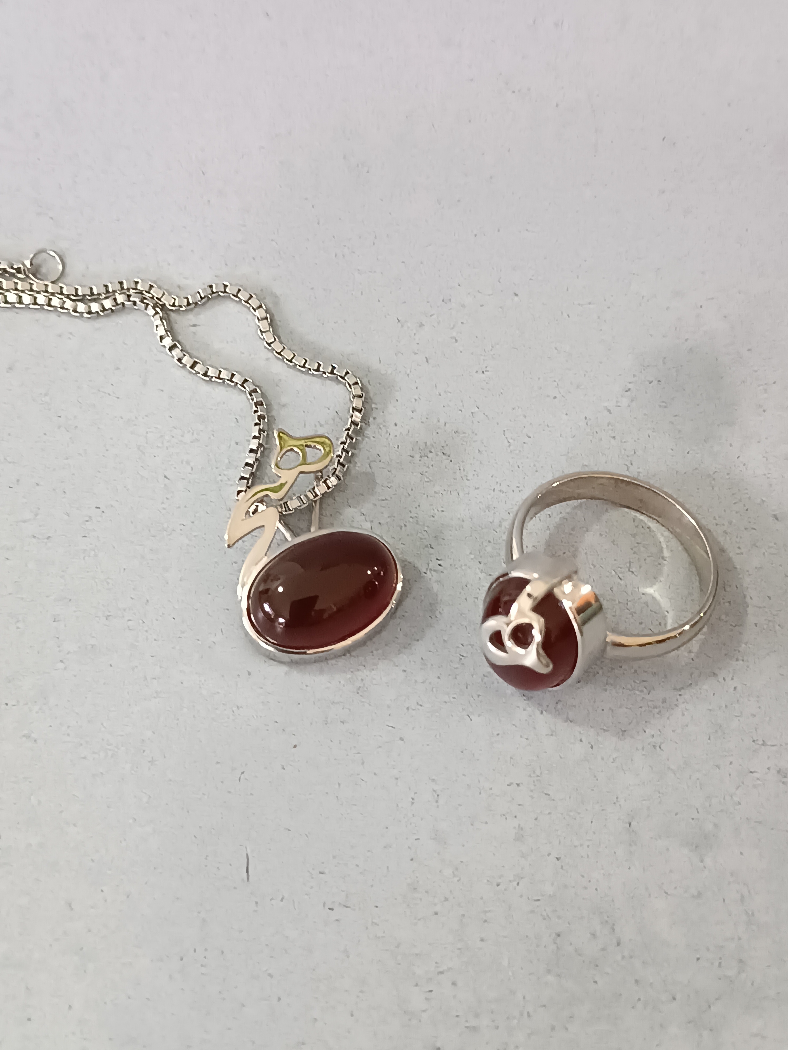 سرویس نقره هیچ شامل گردنبند انگشتر و گوشواره نگین های طبیعی عقیق سرخ نقره دستساز با آبکاری رودیوم بدون زنجیر