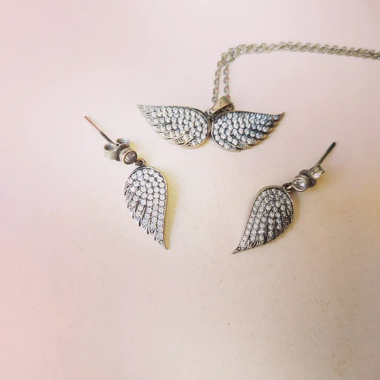 نیم ست بال فرشته نقره استرلینگ آبکاری طلا سفید این نیم ست شامل گوشواره و آویز بهمراه زنجیر استیل میباشد.