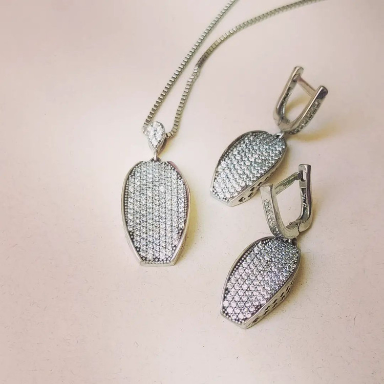 نیمست نقره استرلینگ آبکاری رودیم نگین های اتمی اتریشی شامل گردنبند و گوشواره و همراه با زنجیر استیل میباشد.