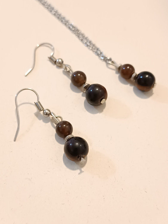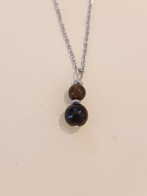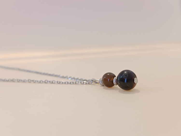 گردنبند مهره ای که از دو مهره عقیق و چشم ببر بهمراه زنجیر استیل.مناسب برای چاکرای سوم و پنجم است.